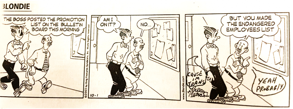 But all hope is not lost! I recently went to the University Archives in person for the first time (10/10 would recommend checking it out yourself), where I got to look through the Wayne Gathright Collection—just one collection of many in UW’s LGBTQIA+ archive. Gathright’s collection contains mostly newsletters, event information, and literature related to LGBTQ+. communities in Madison and Dane County, specifically the trans community, all collected by Gathright himself, a self-identified heterosexual crossdresser. Flipping through the collection’s folders was a very rewarding experience. The early 2000’s Madison Area Transgender Association newsletters are rich with advice and local resources for trans people in Madison, eye-opening personal writings and essays, and sometimes newspaper comic strips—lightly edited with a transsexual flair.