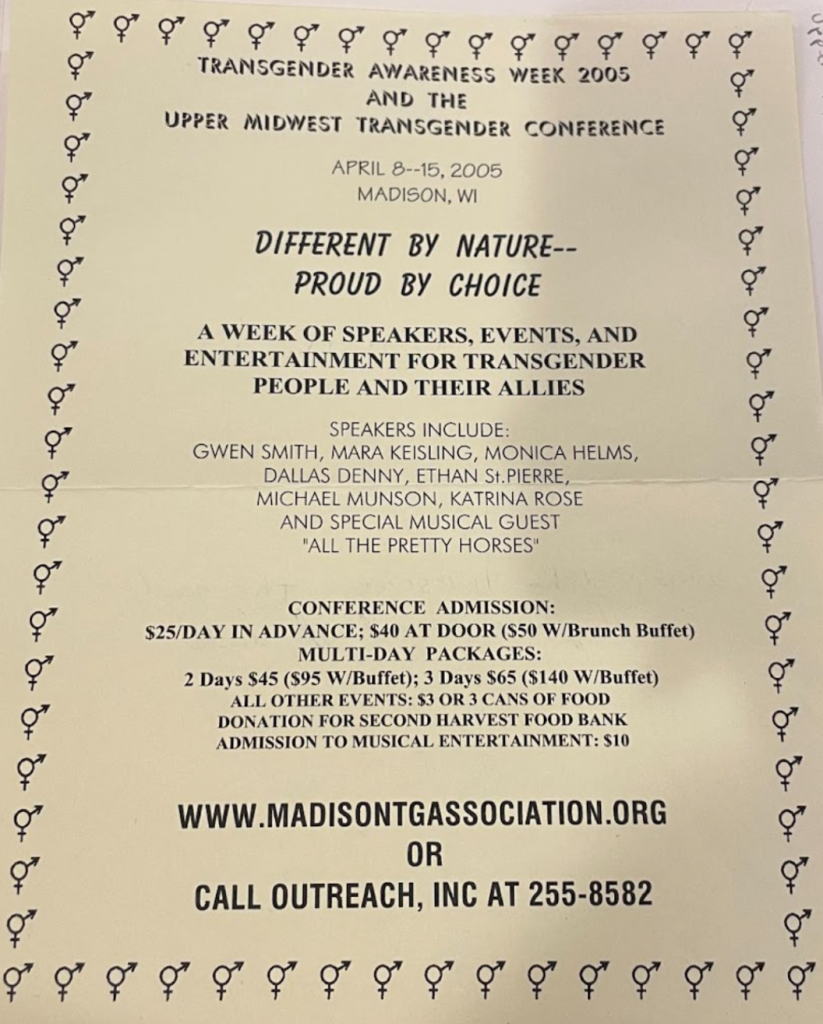 I was luckily able to find many sources advertising TGD-related events on the UW campus, such as this flyer for the 2005 Upper Midwest Transgender Conference, held at the Memorial Union and partially sponsored by the UW LGBT Campus Center (now the GSCC). These kinds of sources will help give me a better understanding of how recognition and acceptance of trans identity at UW evolved over the years, and I plan on using them to sketch out a rough timeline of trans history at UW. Overall, this background research will help me create the historical narrative I want to share through my research as Student Historian, while also revealing the many gaps that remain. This is why I am leaning towards an oral history project, so that TGD students, staff, faculty, and alumni at UW-Madison can have the agency to create the history and future of their own community.