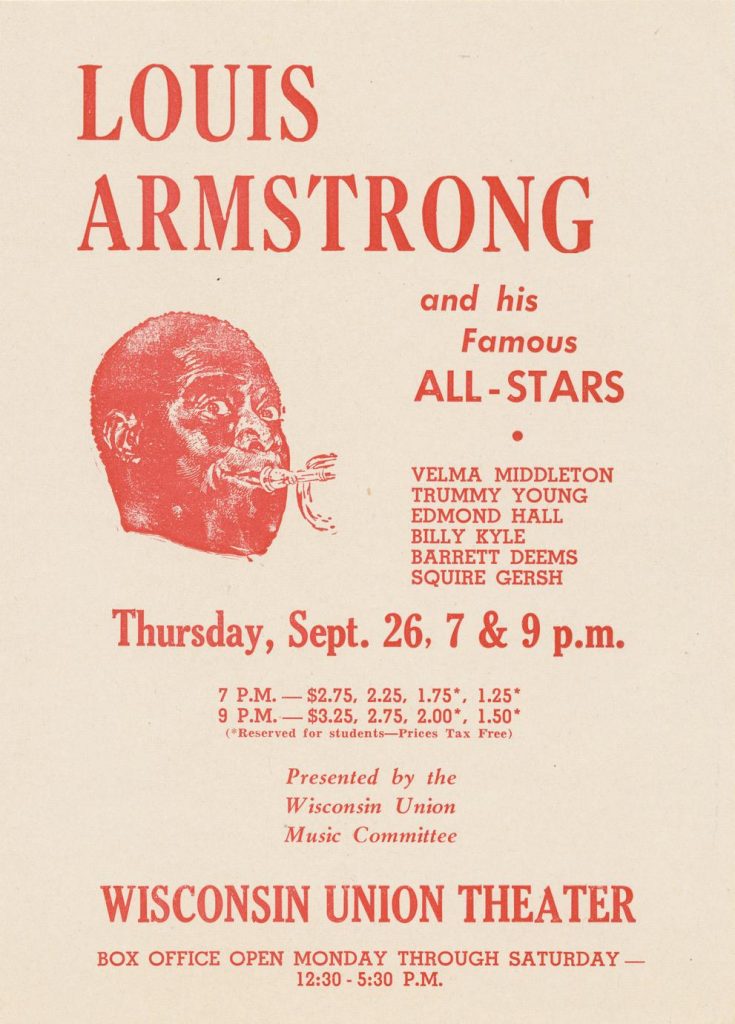 Born in New Orleans, Louisiana, in 1901, Louis Armstrong had his sights set on becoming a professional musician from an early age. Known for his improvised solos and expressive vocals, Armstrong would go on to write some of the most influential jazz albums in history. After finding success on the radio, in films, and with recordings, Armstrong decided to form a band and go on tour, and never really stopped until he died in 1971. In September 1957, the Wisconsin Union Theater hosted Louis Armstrong and His Famous All Stars. The Performance was hosted by the Wisconsin Union Music Committee as a part of the Wisconsin Union Directorate, and tickets ranged from $1.50 to $2.75.