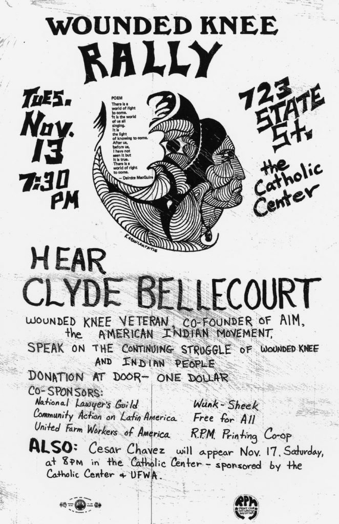 The Wounded Knee flyer presented Clyde Bellecourt, one of the founding members of AIM. Recordings of the event are available at the Wisconsin Historical Society Archives.