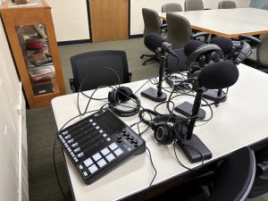 The JRR has a table equipped with a RodeCaster II podcast soundboard and four microphones and headphones for audio recording sessions. Users can connect the board to their laptops and/or cellphones to record or to include additional participants via phone call or video chat.