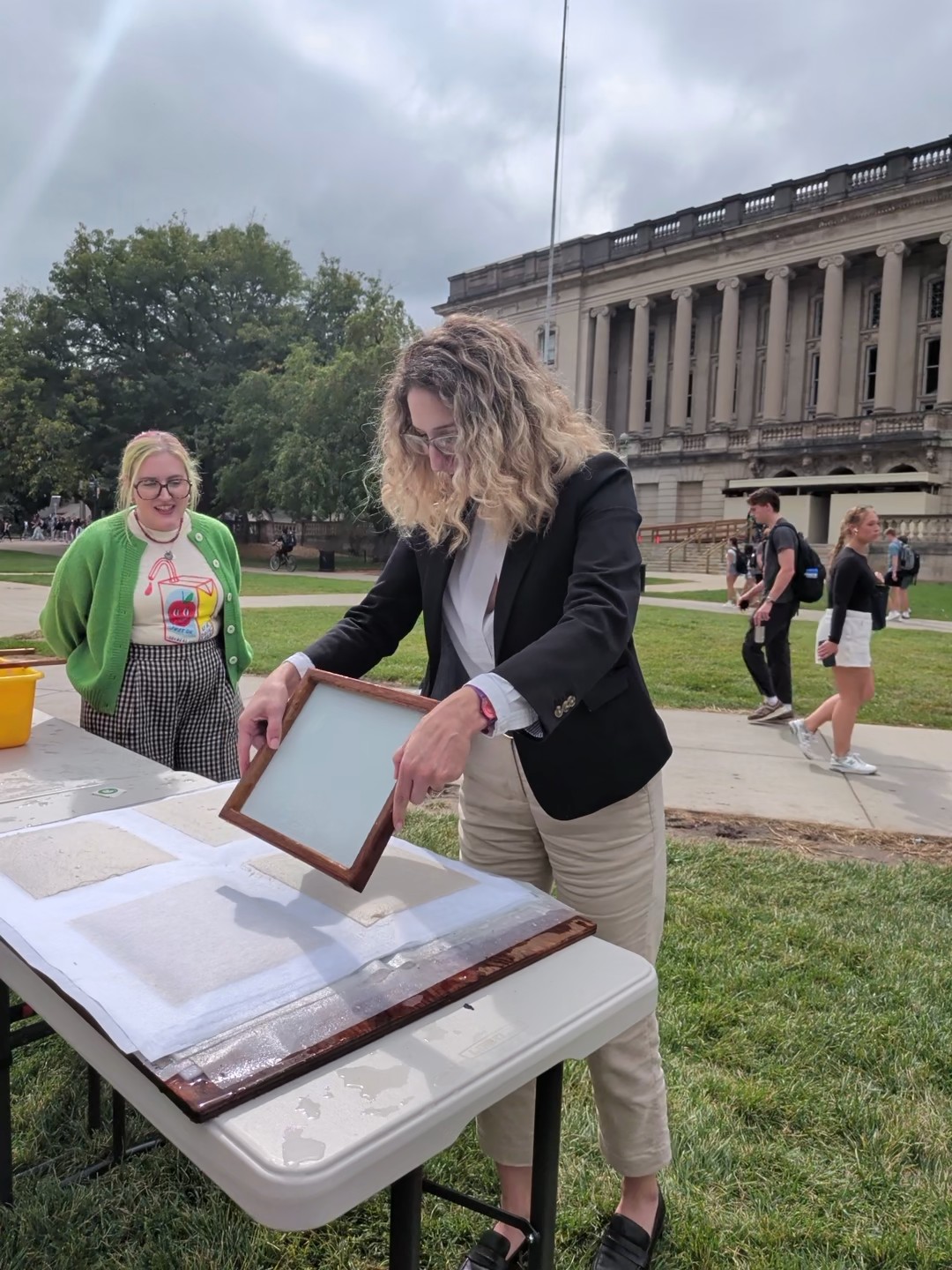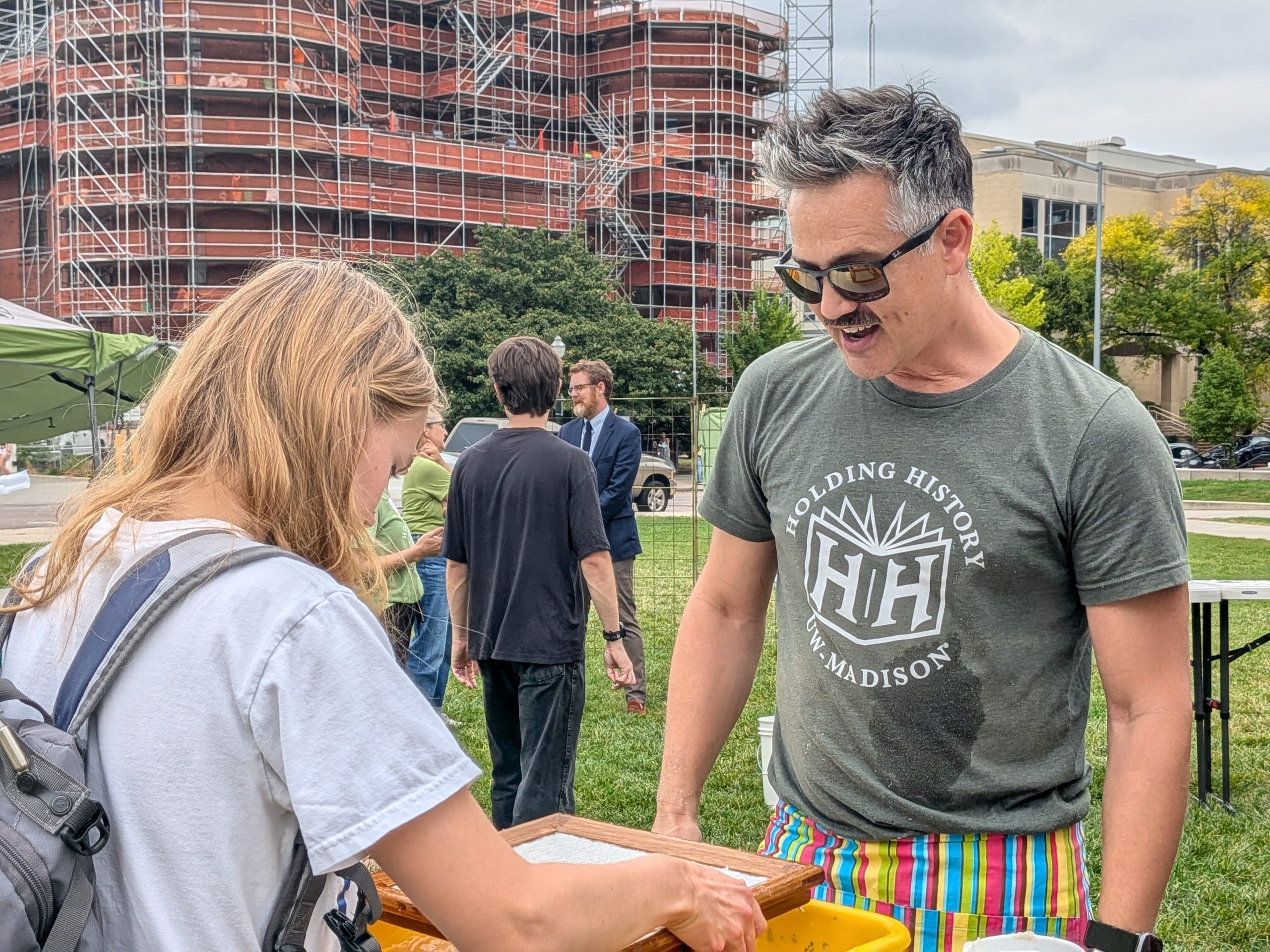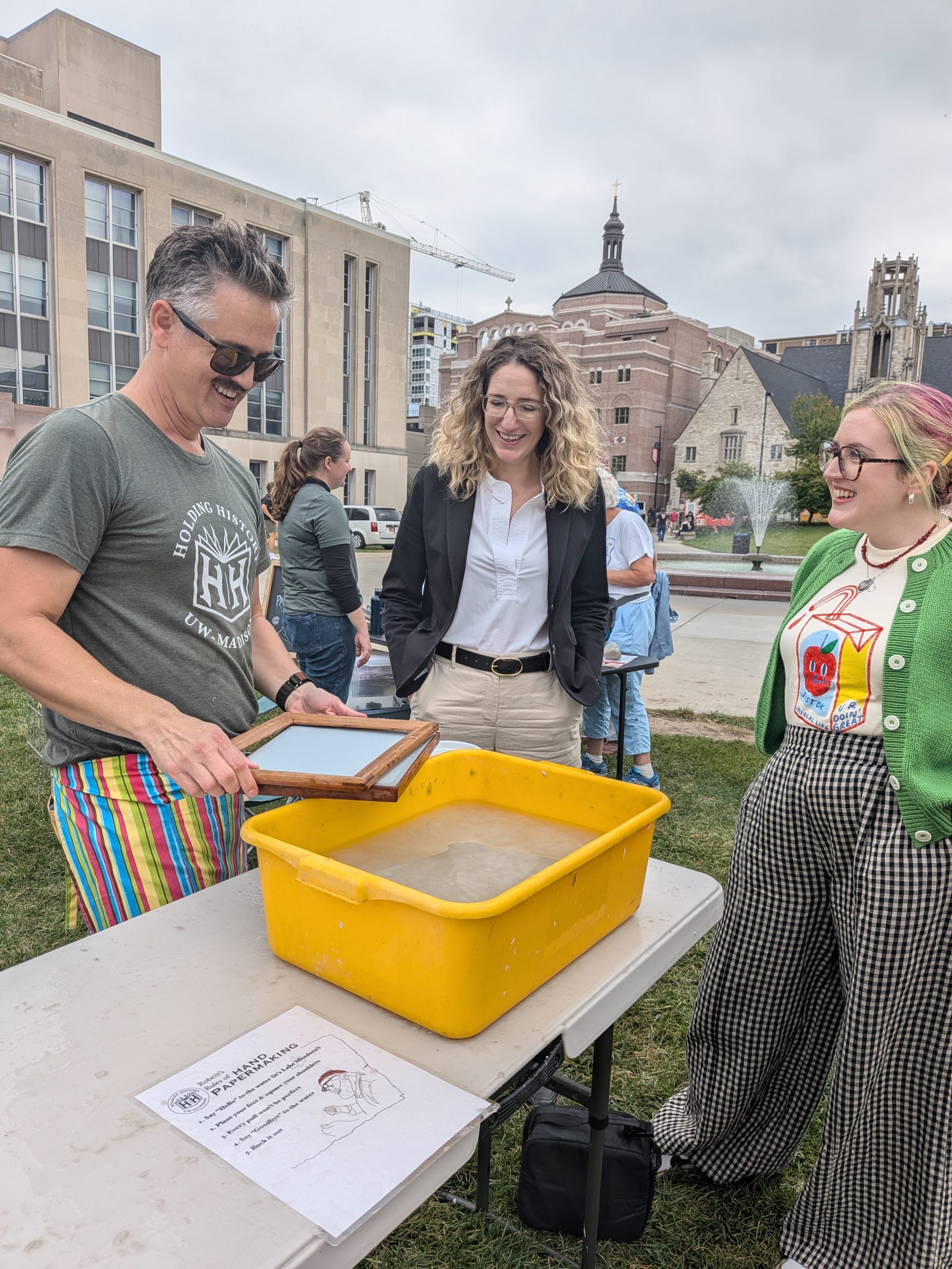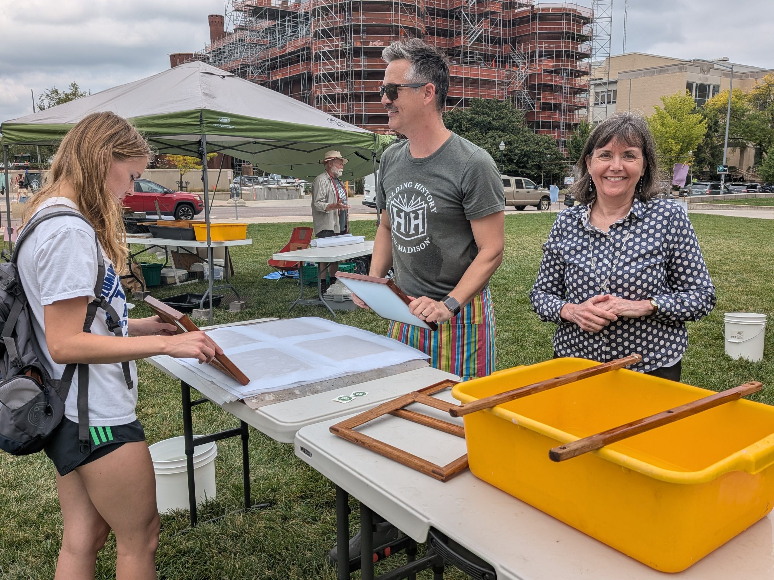 Join us for a FREE, hands-on papermaking session with master papermaker Robert Possehl and Holding History students. Stop by anytime and experience the joy of making a sheet of handmade paper from recycled rags and local wheat straw. Look for our bright green tent!
