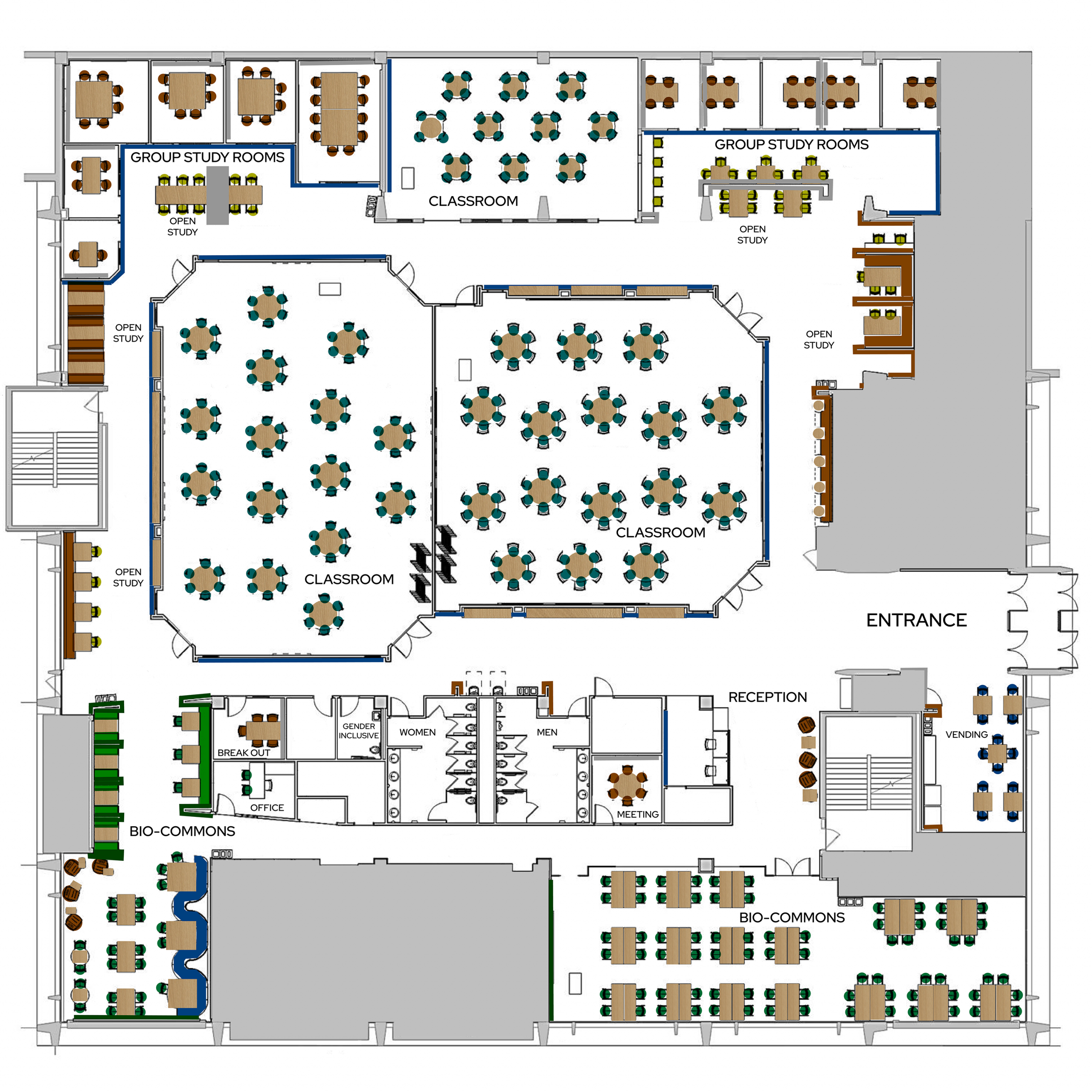 The 1st floor closed beginning May 19, 2025 for renovation. Study spaces will reopen in June 2026 with the active learning classrooms opening for the Fall semester 2026. This exciting renovation will include: